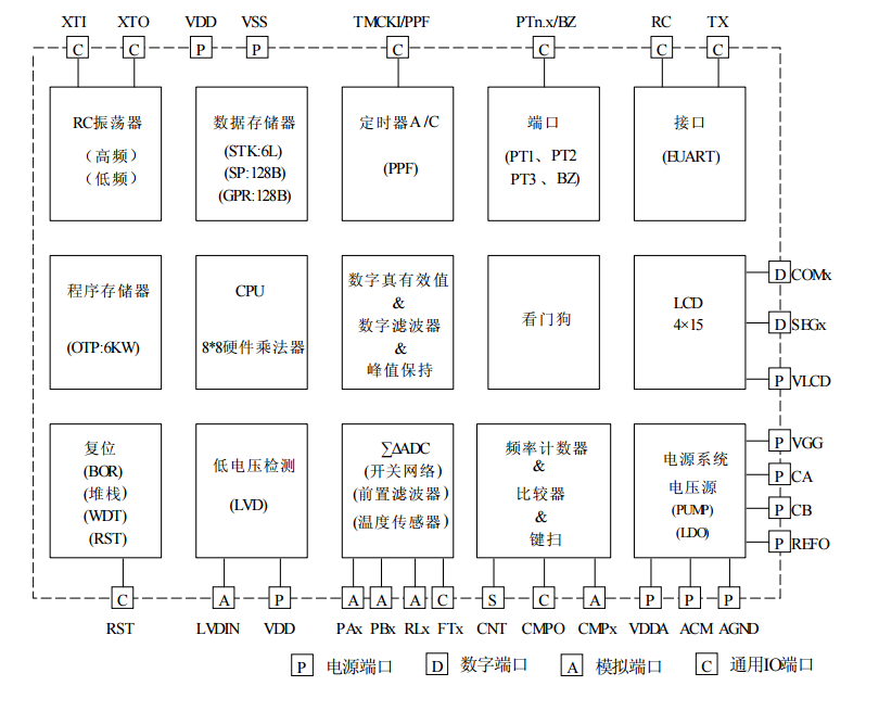 4×15 LCD 液晶驅(qū)動器 Static、1/2、1/3、1/4 Duty 及 1/3 Bias 內(nèi)置 Charge Pump 穩(wěn)壓線路,可提供 4 種 LCD 偏壓 |