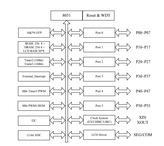 Memory   OTP ROM:16K×8bit(可分為 2×8K×8bit,燒錄 2 次)