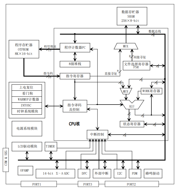 | ○ | 內(nèi)置振蕩器:1MHz | ○ | 20 個(gè)雙向輸入輸出口(包括蜂鳴輸出和 PDM 輸出) | |